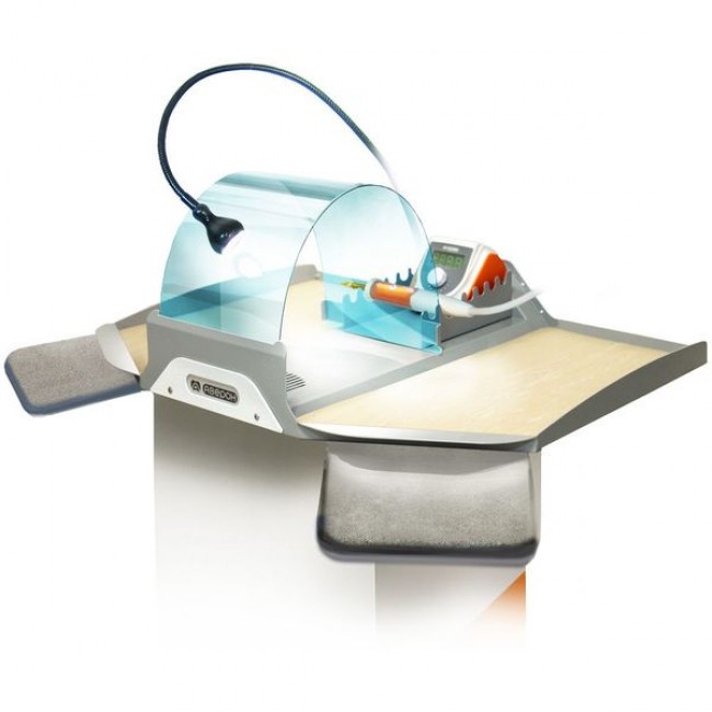 Настольный вытяжной модуль. Позволяет оперативно и без дополнительного инструмента организовывать и сворачивать на любом столе рабочее место для механической обработки. Отходы локализуются в пределах большой рабочей площади поддона. После каждой работы поддон с отходами легко вытряхивается и у вас остается чистое рабочее место. В конструкции предусмотрены защитный экран и дополнительная подставка для наконечников бормашины, электрошпателя и пульта управления.