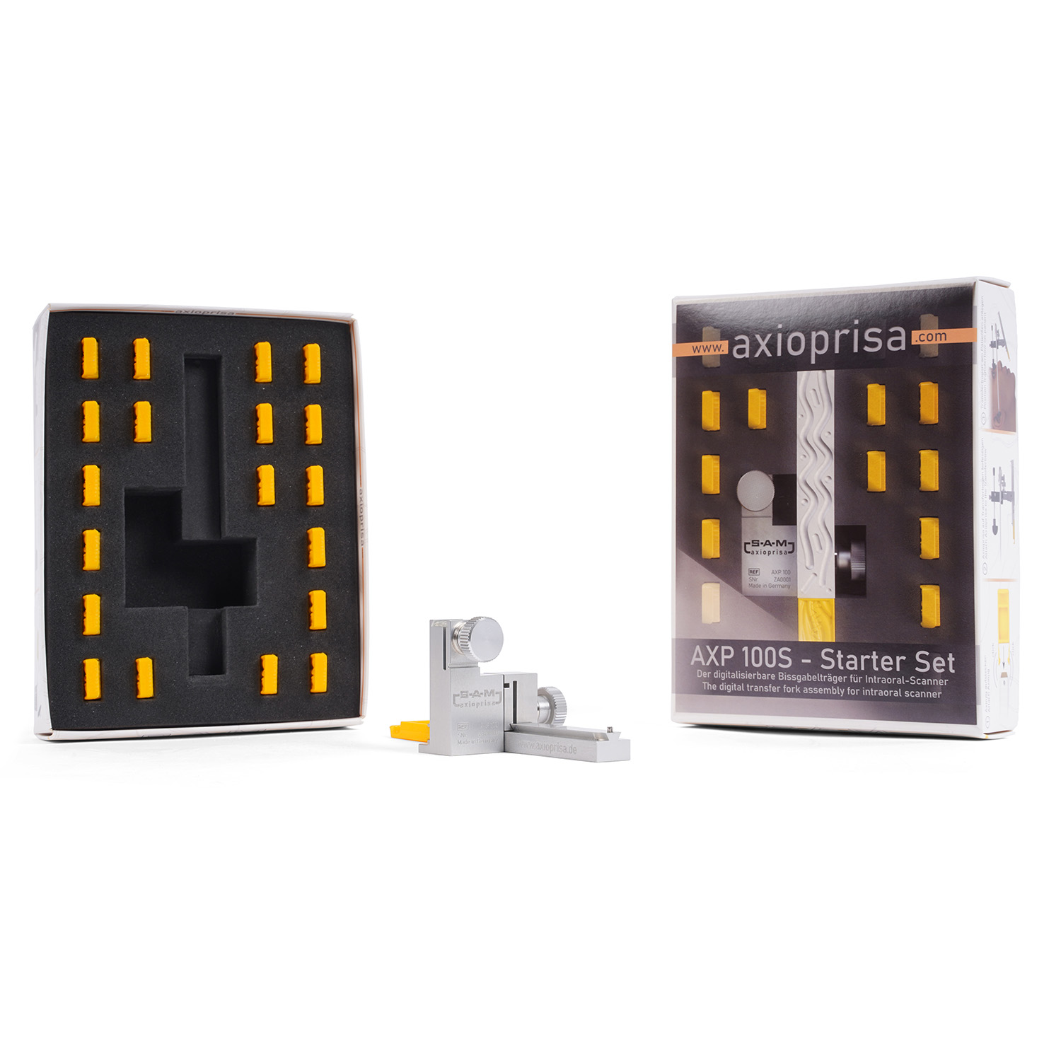 Сборка переноса Axioprisa прикреплена к переносной дуге SAM обычным способом. Благодаря комбинации Axioprisa и переносной дуги можно сканировать верхнюю челюсть в правильном анатомическом положении. Франкфуртская горизонталь — это плоскость, используемая всеми артикуляторами SAM. Используя этот путь, можно переносить положение челюсти с дополнительным сканированием во время внутриротового сканирования. Путь к простым процессам в стоматологической практике позволяет свести источники ошибок к минимуму.