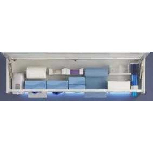 Настенный модуль в комплекте: открывающаяся вверх дверца, диспенсер с мылом на фотоэлементах, диспенсеры с очками, масками, крепление для рулонной бумаги, отделения для перчаток.