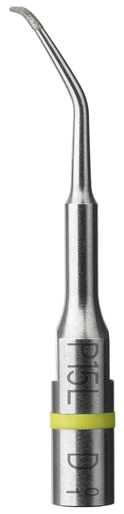 Насадка P15LD «Левосторонняя», для минимально-инвазивной апикальной хирургии. Для ретроградной распломбировки корневого канала премоляров левой стороны нижней и верхней челюсти (при возможности доступа). После выполненной резекции верхушки корня Пьезотомом или вращающимся инструментом. Удлинённая рабочая часть кончика насадки 5мм. Рекомендована для препарирования каналов резцов при апикальной резекции / микрохирургическом эндодонтическом вмешательстве. Ретроградная распломбировка канала такими насадками показана при невозможности прохождения канала в виду наличия в нём индивидуальной литой корневой вкладки, при фиксации на зубе протяжённой ортопедической конструкции. Этот метод позволяет сохранить ортопедическую конструкцию интактной. При полной ревизии корневого канала и резекции верхушки корня вместе с инфицированной дельтой корневого канала, ретроградная пломбировка с применением ультразвкуковых насадок для апикальной хирургии позволяет достичь наилучших долгосрочных результатов. Алмазное покрытие 30 мкм, конусность 7%.