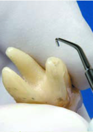 Рабочая часть насадки расположена на её кончике, это последние 2 – 3 мм. Кончик насадки (рабочую часть насадки), следует располагать соосно продольной оси зуба. Насадкой, не погружая её сразу в десневую борозду, необходимо пройти по периметру зуба, убирая доступные для обзора наддесневые (или поддесневые) отложения, без чрезмерного латерального давления. Начинайте работу с лицевой стороны зуба перемещаясь к мезиальному или дистальному краю.