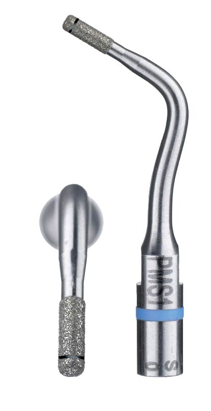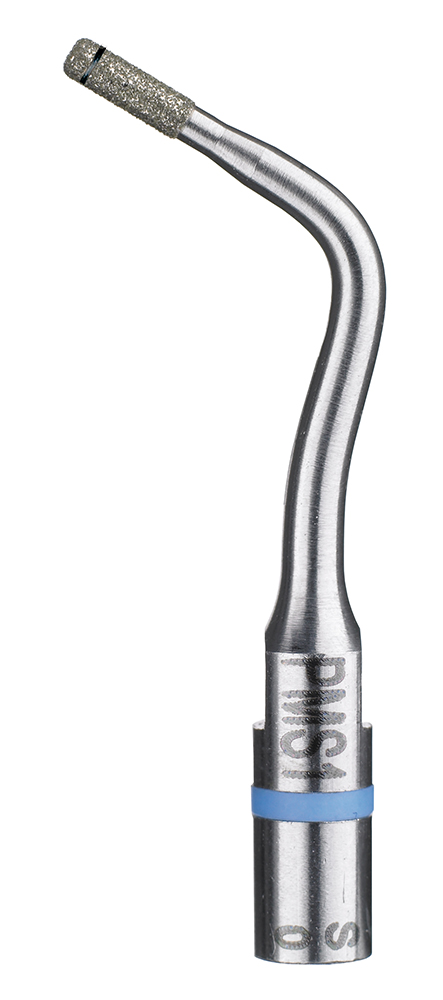 Насадка для скайлера PM1, с алмазным покрытием, для препарирования уступа. Прямой плоский кончик. Первичное препарирование осуществляется с помощью вращающихся инструментов до линии эмалево-дентинного соединения. Далее используется насадка c алмазной крошкой PM1 (выпукло-закруглённая) или насадка PMS 1 с закруглённым внутренним углом для смещения линии обработки в апикальном направлении. Ультразвуковыми насадками заглаживаются бороздки от алмазных боров и уступ погружается под десну. Горизонтальное перемещение осуществляется совершенно естественно и легко, поскольку при использовании инструмента сохраняется тактильная чувствительность. Лазерная маркировка, находящаяся на расстоянии 1 мм от кончика насадки, позволяет легко создавать границу препарирования. Несмотря на высокую мощность (синий код), наконечники Newtron обладают тактильной чувствительностью, которой невозможно достичь при работе с бором.