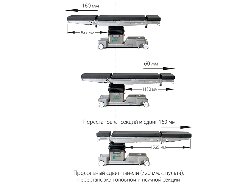 Продольный сдвиг до 320 мм обеспечивает отсутствие «мертвых зон» при проведении рентгенографии. Перестановка местами головной и ножной секций в сочетании с продольным сдвигом обеспечивают рентгенопрозрачную консоль 1525 мм. Предусмотрена функция «нулевого» положения панели с возможностью экстренной остановки. Управление всеми функциями стола производится с помощью ручного пульта или дублирующего пульта на колонне. Возможно управление с помощью ножного педального блока управления (опция).