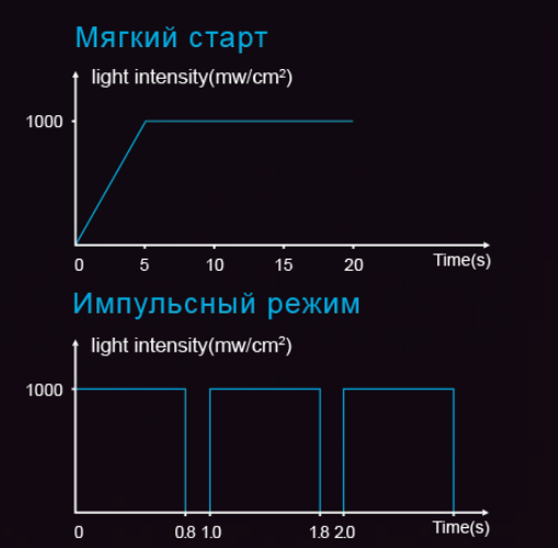 • в режиме полимеризации 1000mw/cm², 1500mw/cm², 2300mw/cm² , 600mw/cm²