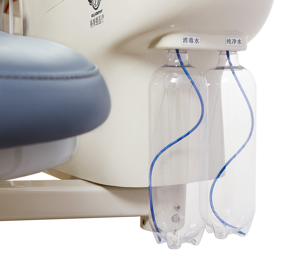 Две бутылки для подачи воды и дезинфектанта облегчают работу обслуживающего персонала. Можно использовать для дезинфекции всего трубопровода и внутреннего контура шлангов блока врача и ассистента.