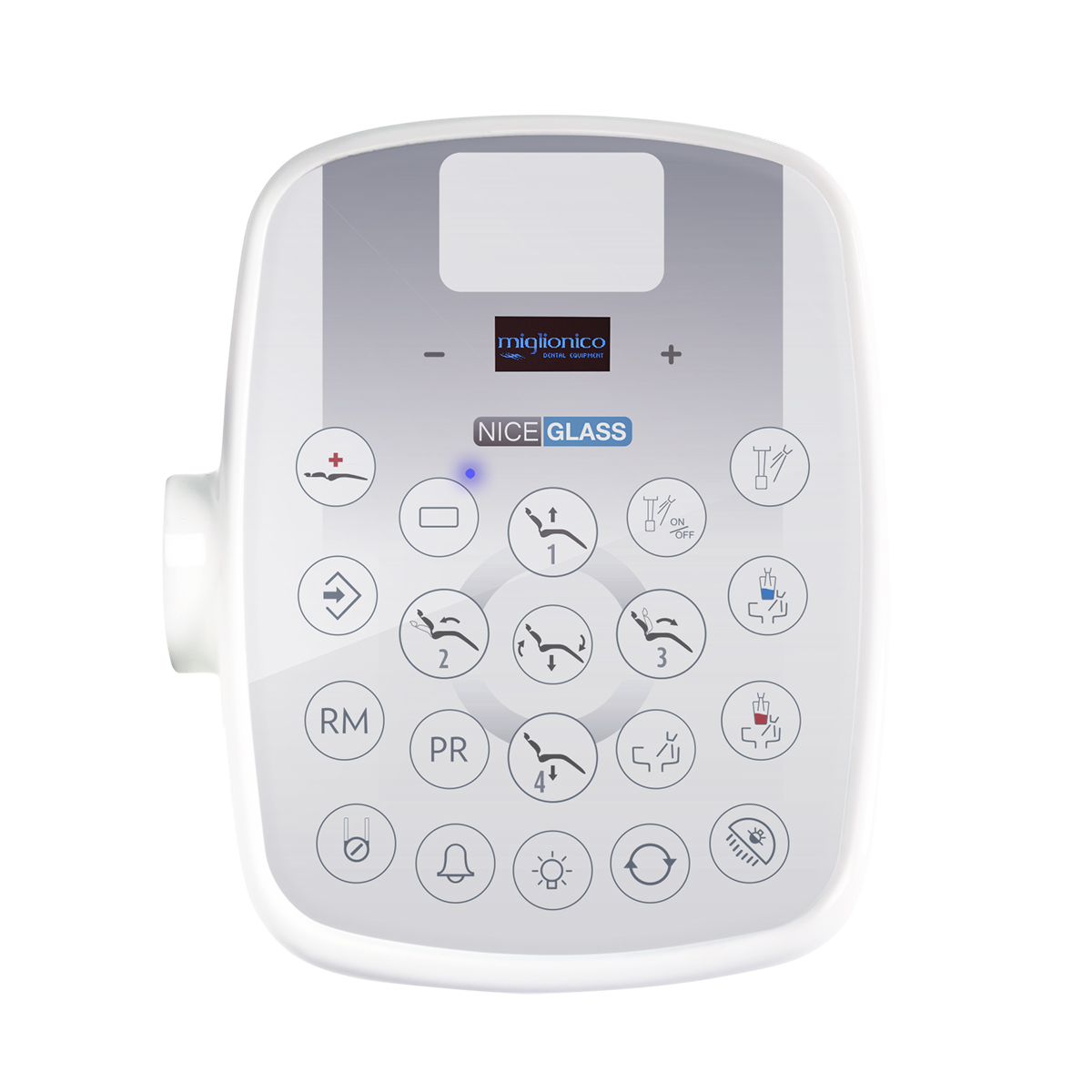 • Многофункциональная клавиатура со стеклянной поверхностью и дисплеем (управление креслом, регулировка мощности скалера, контроль оборотов микромотора, программирование времени подачи холодной/горячей воды в стакан пациента, включение/выключение светильника, реверса оборотов микромотора).
