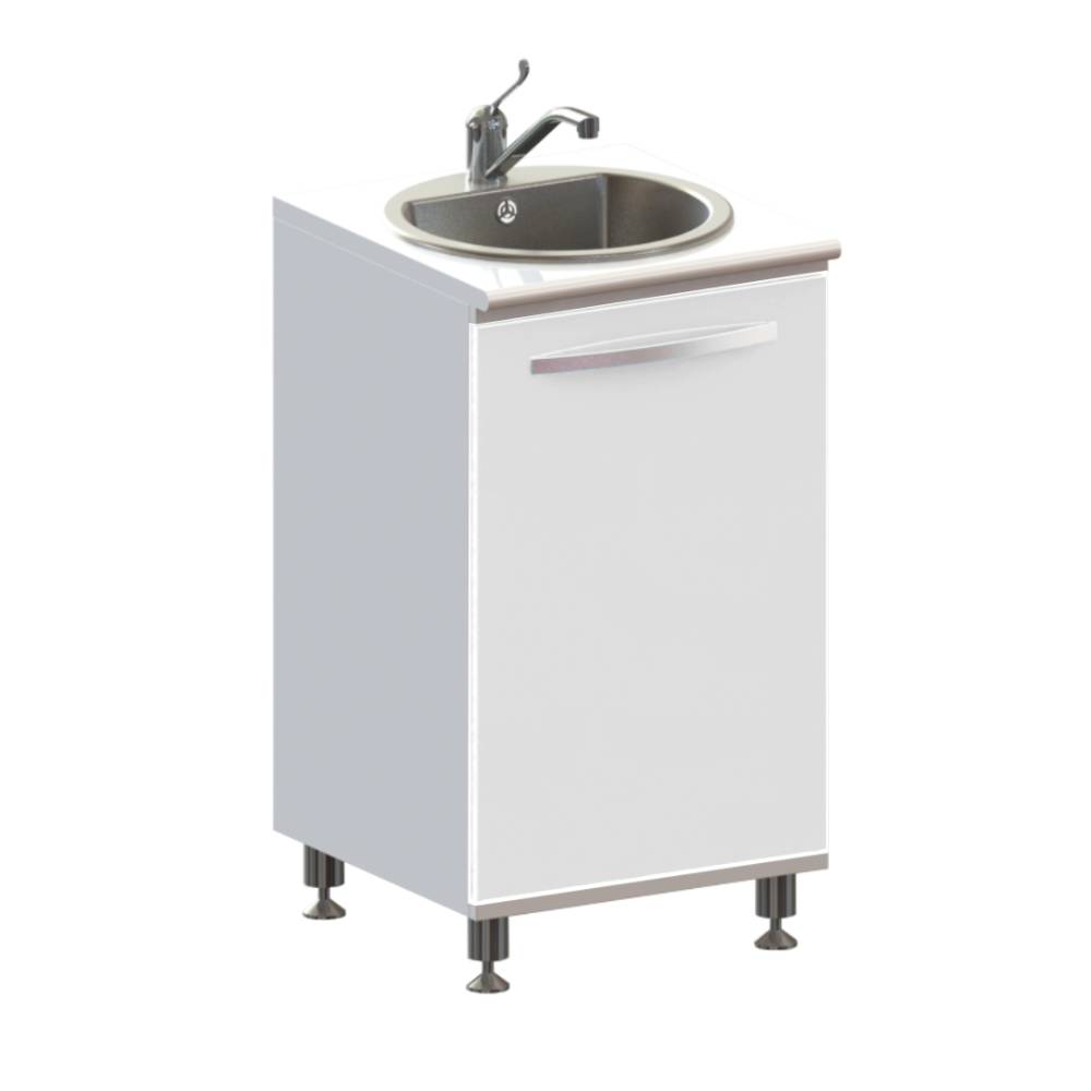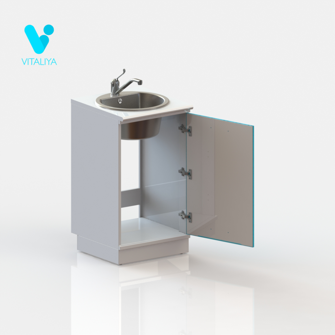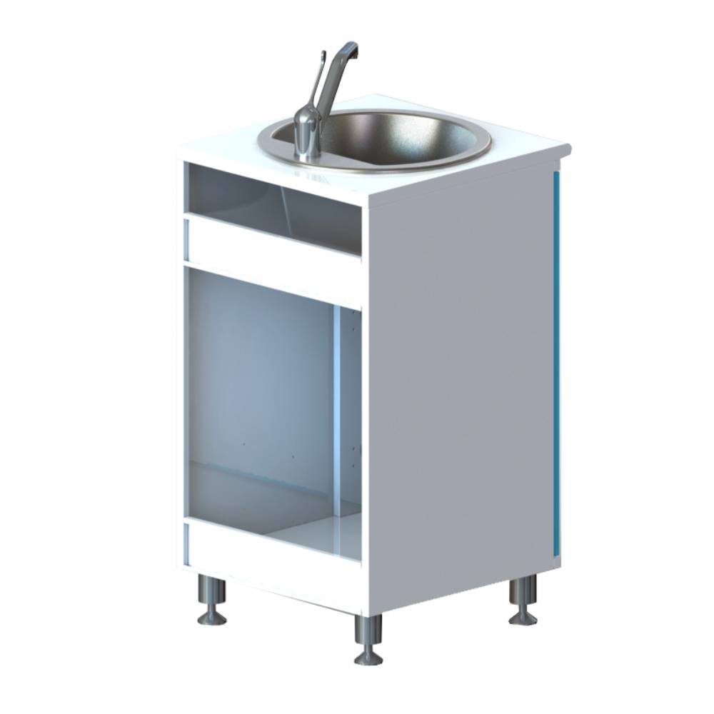 Тумба металлическая цельносварная, выполнена из листового металла толщиной 1 мм и окрашена полимерно-порошковой краской. Дверь установлена на петли с механизмом плавного закрывания, производства компании HETTICH, Германия. Фасад двери укомплектован ручкой-скобой из нержавеющей стали с межцентровым расстоянием 320 мм, цвет брашированный сатиновый никель. Задняя стенка тумбы имеет технологические вырезы под коммуникации. Тумба изготовлена в варианте на подиуме высотой 100 мм с регулируемыми опорами. Комплектуется раковиной из нержавеющей стали, производства компании OULIN, Германия, сифоном и локтевым смесителем.