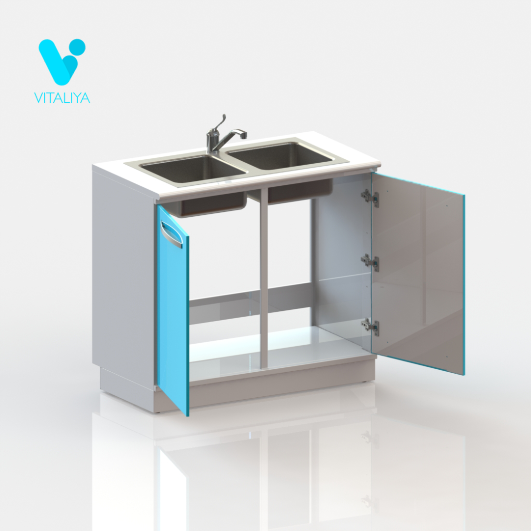 Тумба металлическая цельносварная, выполнена из листового металла толщиной 1 мм и окрашена полимерно-порошковой краской. Двери установлена на петли с механизмом плавного закрывания, производства компании HETTICH, Германия. На фасады установлена ручка-скоба из нержавеющей стали с межцентровым расстоянием 320 мм, цвет брашированный сатиновый никель. Задняя стенка тумбы имеет технологические вырезы под коммуникации. Тумба изготовлена в варианте на подиуме высотой 100 мм с регулируемыми опорами. Комплектуется раковиной из нержавеющей стали, производства компании Reginox, Голландия, сифоном и локтевым смесителем.