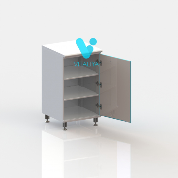 Тумба металлическая цельносварная, выполнена из листового металла толщиной 1 мм и окрашена полимерно-порошковой краской. Дверь установлена на петли с механизмом плавного закрывания, производства компании HETTICH, Германия. Фасад двери укомплектован ручкой-скобой из нержавеющей стали с межцентровым расстоянием 320 мм. Тумба изготовлена в варианте на регулируемых хромированных опорах высотой 100 мм. Внутри установлены две съёмные полки.
