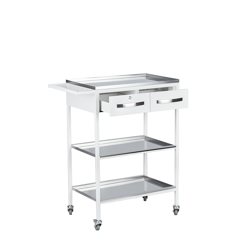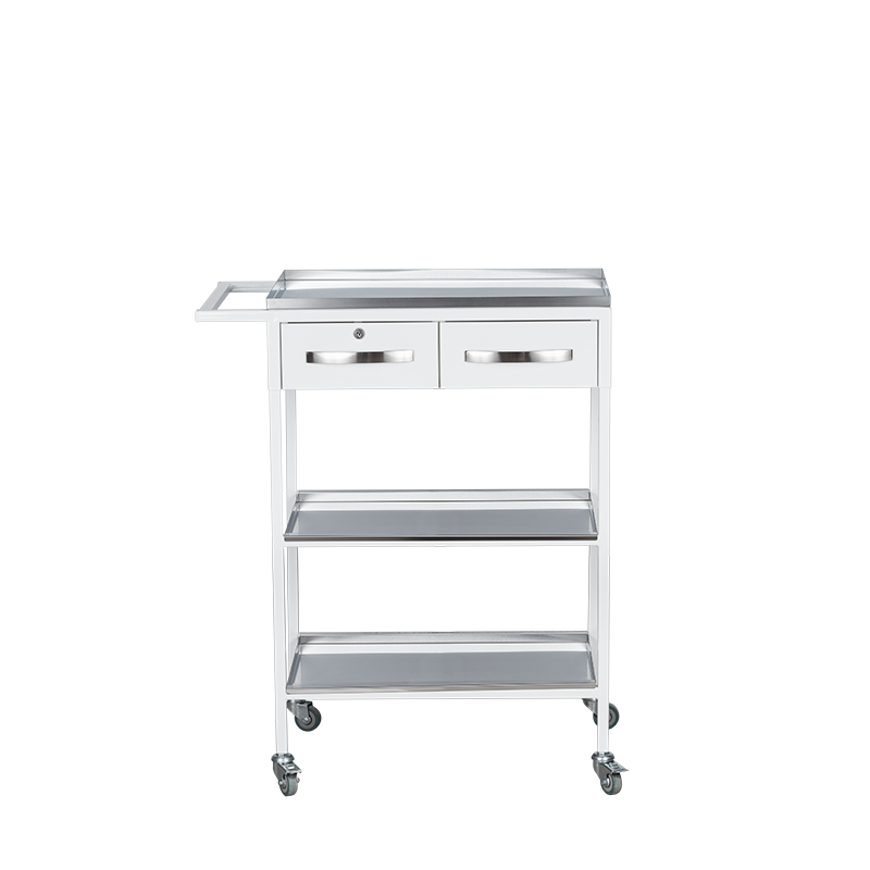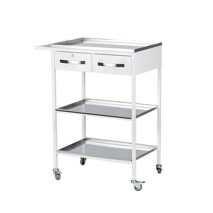 С 2 выдвижными ящиками. Колёса d 50 мм., две колеса с тормозом. Верхний ящик с замком.