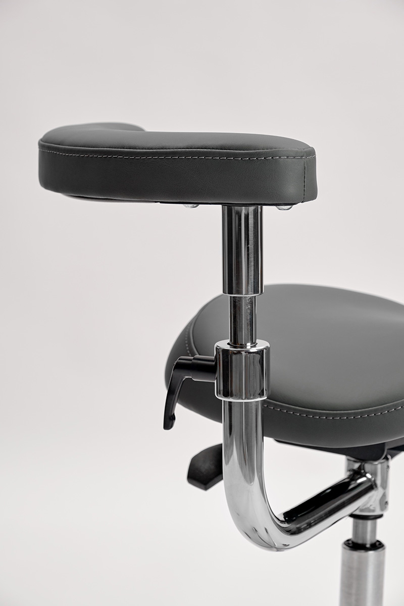 Стул оснащён абдоминальным упором, который позволяет поддерживать поясничную область врача и обеспечивает комфорт во время работы. Благодаря возможности настройки на 3600, абдоминальный упор также служит для поддержки локтей.